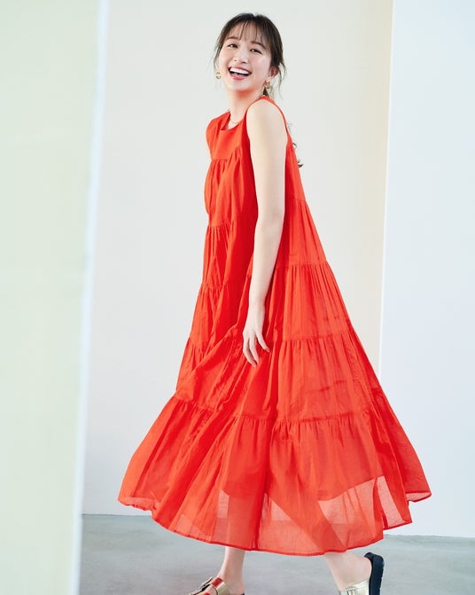 ティアードタイプのサマードレス。ボリューム感のあるティアードデザインが華やかな、一枚で着映えるワンピース。胸元から5段で切り替えとギャザーを入れたティアードデザインで、裾に向けて分量感を持たせたフレアシルエット。
