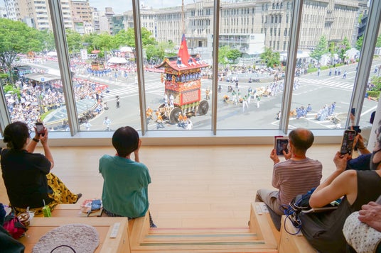 ガラス張りの会場からは、祇園祭のハイライトである「辻回し」を眼下に望むことができ、京都文化博物館の学芸員による解説も予定。空調完備の快適な空間で祇園祭を満喫することができます。