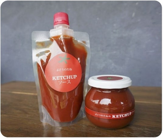 ぶどうのたねオリジナルKETCHUPソース パウチ(210g)756円、瓶(210g)756円 自然豊かなうきはの土地で大切に育てられたトマトから、無添加のケチャップソースができました。 完熟のトマトをベースに、玉ねぎやりんご酢、さらにしょうがや香辛料をプラス。しっかりとトマトの旨みが感じられる大人のケチャップソースです。
