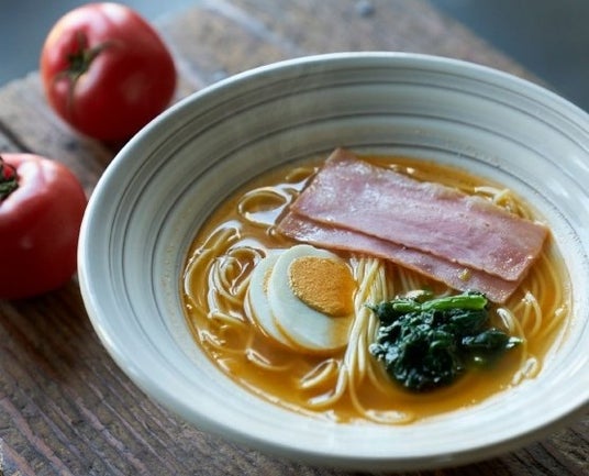 とまとラーメン(1袋、2食入り)648円 ※写真は調理例です。「地元産とまと“桃太郎”はおいしいが流通に乗らない規格外品もある。何とかできないか」と農協から相談を寄せられた小林稔男代表。試作を重ね、試食を繰り返しできあがったのがこの“とまとラーメン”。コシのある麺に絡むスープは、とまとならではの酸味とコクが絶品!最後はご飯と粉チーズを入れてリゾット風にする楽しみ方もおすすめ。