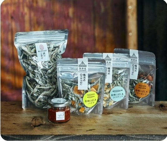 右)湧き出る温泉ガスでたくさんのプランクトンが育つ橘湾は天然のいけす。そこで育ったカタクチイワシは旨みたっぷりです。その魅力をぎゅっと閉じ込めたいりこは、だしだけではもったいない。電子レンジにかけてそのまま食べたら天然のおやつ。バナナやアーモンド などと合わせた商品は「&LOCALS」でもロングセラーです。 ほかにも、インドネシアからの技能実習生が故郷の調味料が恋しくて、自ら獲った煮干しを加えて作った“ニボサンバル”などアイデアたっぷりの商品が揃います。