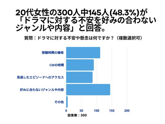 20代女性の300人を対象とした「ドラマに対する不安や懸念は何ですか?」というアンケートで145人(48.3%)が「好みの合わないジャンルや内容」という結果になりました。