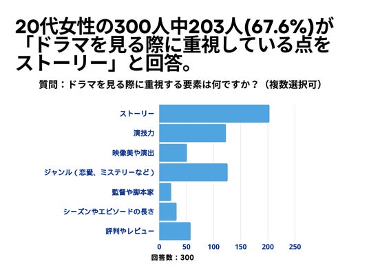 20代女性の300人を対象とした「ドラマを見る際に重視する要素は何ですか?」というアンケートで203人(67.6%)が「ストーリー」という結果になりました。
