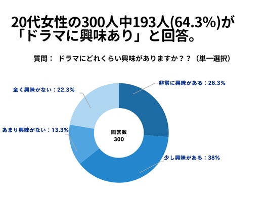 20代女性の300人を対象とした「ドラマにどれくらい興味がありますか?」というアンケートで193人(64.3%)が「ドラマについて興味あり」という結果になりました。