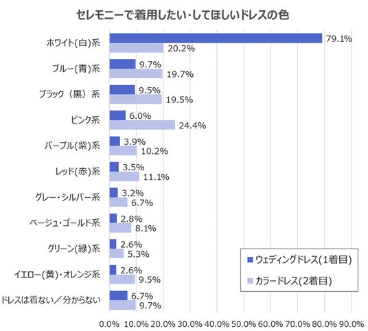 1着目のウェディングドレスで最も人気だったのは「ホワイト(白)系」で、79.1%の人が“王道”カラーを選びました。2位は「ブルー(青)系」(9.7%)でしたが、3位にトレンドの「ブラック(黒)系」(9.5%)がランクインしました。