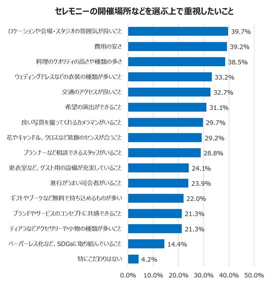 また、セレモニーを「開きたい」と回答した人を対象とし、結婚式場やフォトスタジオ、セレモニーのプロデュース会社などを選ぶ際に重視したいポイントを調査しました。