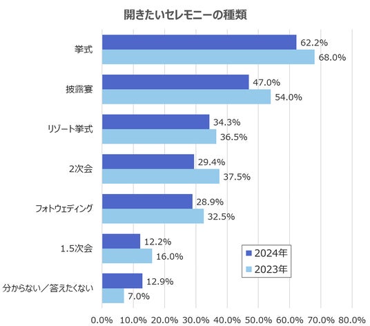 その結果、定番の「挙式」(62.2%)、「披露宴」(47.0%)が昨年同様トップ2となり、「リゾート挙式」(34.3%)が3位となりました。昨年調査と比較すると、「開きたい」と回答した人が減っていることもあり、どのタイプも減少傾向となりました。