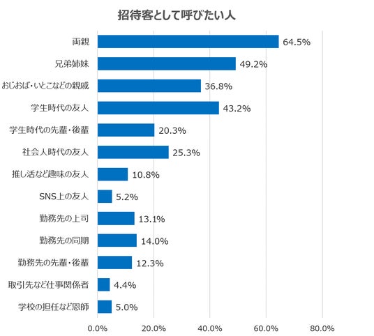 招待客として呼びたい人ごとに平均値を出したところ、トップ3は「両親」(64.5%)、「兄弟姉妹」(49.2%)、「学生時代の友人」(43.2%)でした。