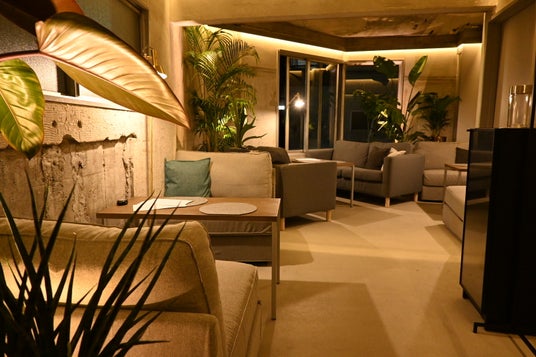 コンクリートの無機質な空間に間接照明と植栽が浮かび上がる。