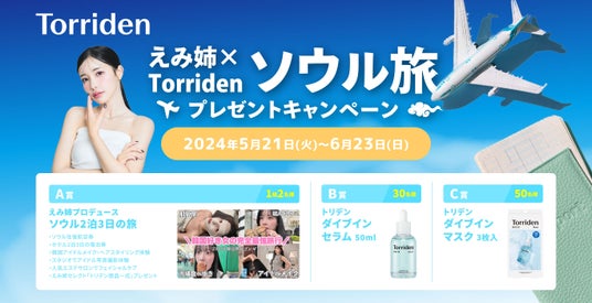 マルマンH&B株式会社(本社:東京都千代田区、代表取締役社長:溝田 勝彦)は、韓国のスキンケアブランド「Torriden(トリデン)」の対象商品購入レシートによるご応募で、韓国ソウル2泊3日ペア旅行や、トリデン人気商品が当たる『えみ姉×Torridenソウル旅プレゼントキャンペーン』を、2024年5月21日(火)20:00から2024年6月23日(日)23:59まで実施いたします。本キャンペーンは、全国のドラッグストア、バラエティショップ、コンビニ等で「トリデン ダイブインマスク3枚入」1個、もしくは「トリデン ダイブインマスク1枚入」3個購入で1口としてご応募すると、抽選でペア1組2名様に韓国ソウル2泊3日旅行、30名様にトリデン ダイブインセラム 50ml、50名様にトリデン ダイブインマスク3枚入が当たります。期間中、当選するまで何度でもご応募いただけます。抽選結果についてはその場で発表されますが、当選賞品はキャンペーン終了後の6月下旬頃に「LINE」のTorriden(トリデン)公式アカウントよりご連絡いたします。