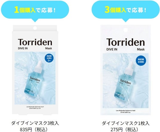 応募方法:「トリデン ダイブインマスク3枚入」を1個、もしくは「トリデン ダイブインマスク1枚入」を3個で1口とし、「LINE」のTorriden(トリデン)公式アカウントからご応募ください。対象商品を対象数お買い上げの複数枚のレシートの合算でもご応募可能です。