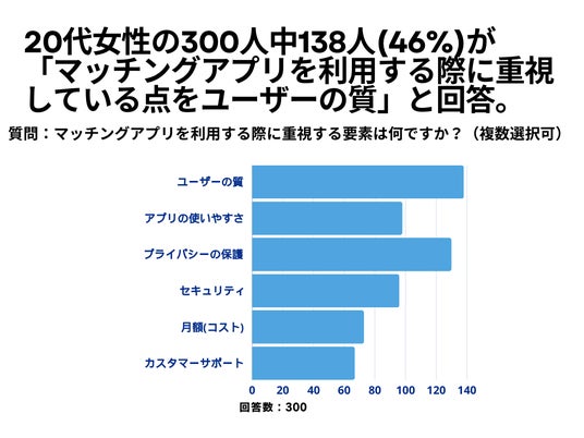 20代女性の300人を対象とした「マッチングアプリを利用する際に重視する要素は何ですか?」というアンケートで138人(46%)が「ユーザーの質」という結果になりました。