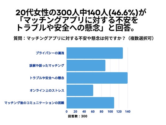 20代女性の300人を対象とした「マッチングアプリに対する不安や懸念は何ですか?」というアンケートで140人(46.6%)が「トラブルや安全への懸念」という結果になりました。