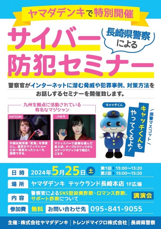 株式会社ヤマダホールディングス(本社:群馬県高崎市、代表取締役会長 兼 社長 CEO:山田 昇、以下、ヤマダホールディングス)は、長崎県警察によるサイバー犯罪の被害防止に向けた取り組みに賛同し、2024年5月25日(土)にグループ企業である株式会社ヤマダデンキ「Tecc.Land 長崎本店」において、長崎県警察による「サイバー防犯セミナー」を開催いたします。