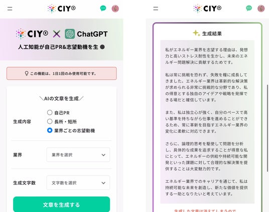 CIY(R)(シーアイワイ)の自己分析結果から、個人の特性や強み弱みを踏まえた業界別の志望動機を、ChatGPTが自動的に生成するサービスを提供開始。