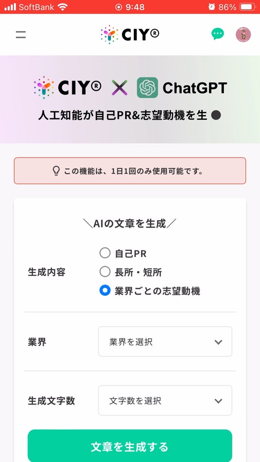 CIY(R)で診断された自己分析結果をベースに、希望する業界と文字数を選ぶことで、ChatGPTが自動的に志望動機を生成してくれる