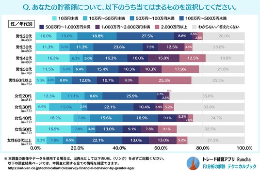 テクニカル分析専門サイト『テクニカルブック』は、性/年代別の収入や資産、投資への意識を調査する目的で、日本国内の20歳以上の男女782名を対象にアンケートを行いました。本調査からは、若者の方が貯蓄額は少ないものの、マネーリテラシーへの自己評価が高く、投資に対して前向きな傾向が見えてきました。