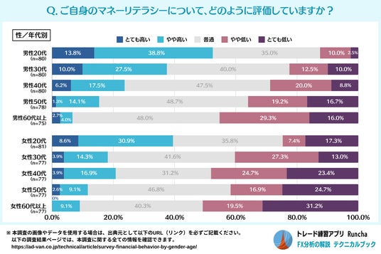 4.20代男性の52.5%が自身のマネーリテラシーを高いと評価、60代以上男性ではわずか6.7%