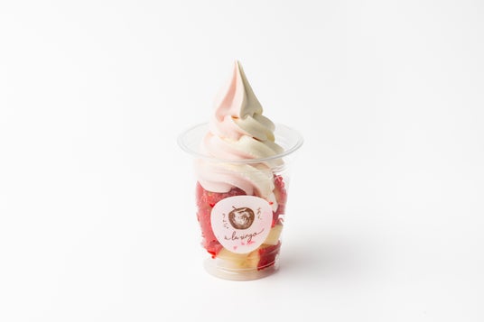 りんご飴は、青森県産ふじを1/2個使用し、食べやすいようにカット。その上に、青森県産りんごジュースを使用した「りんご」と「濃厚ミルク」のミックスソフトをトッピングしました。