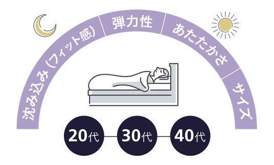 20~40代の「寝心地が良い」とは?エムール睡眠・生活研究所が行った寝心地に関する研究調査によると、20~49歳にとって「寝心地が良い」とは沈み込み(フィット感)・弾力性・あたたかさ・サイズであることがわかってきました。
