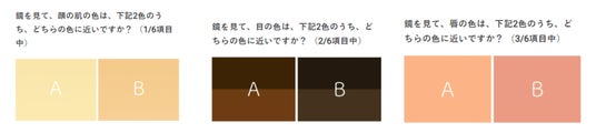 質問内容は、肌の色、唇の色、目の色などに関する、二択の質問です。