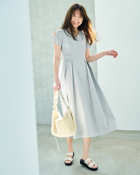 ウエスト位置高めに切り替えを入れたフィット&フレアのワンピースは、街中で視線を集める華やかさとスタイルUPを確約。顔まわりを涼しげに見せるVネックもこだわり。