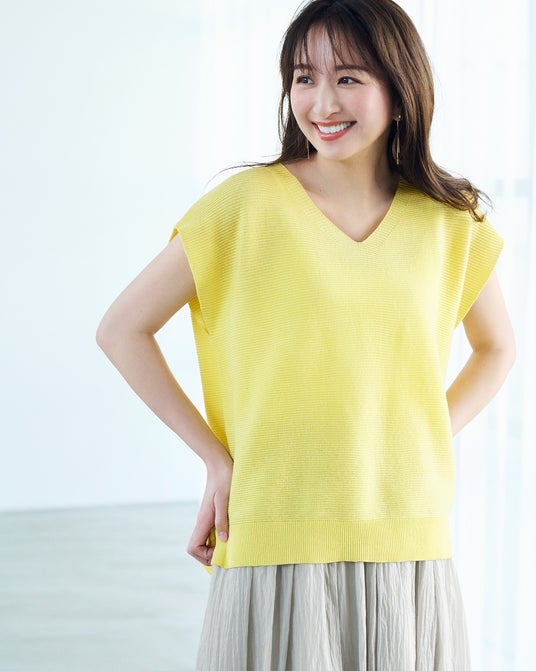 ・カラー展開:ホワイト/ブラック/イエロー/ブラウン/ブルーデコルテを華奢に縁取るVネックに、肩や二の腕のラインをカバーするフレンチスリーブは、風を通すほどよいゆとりのあるシルエット。