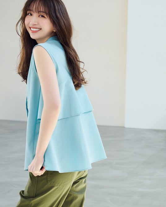 すっきり見えを叶えるノースリーブに、マニッシュなバンドカラー。サイドからバックにかけては、2段のティアードフリルデザイン。
