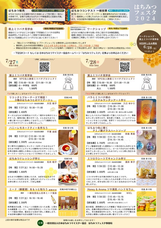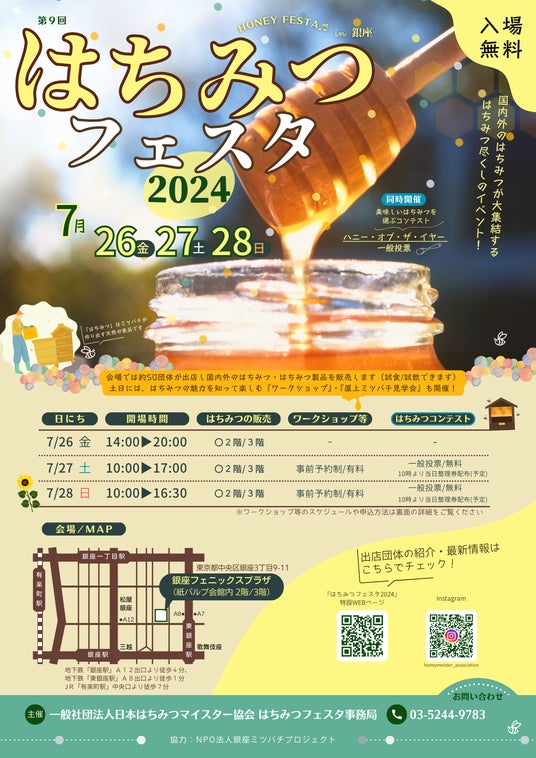 はちみつの資格を運営する一般社団法人日本はちみつマイスター協会(東京都中央区、代表理事:河村千影)は、はちみつの日(8/3)の直前の週末にはちみつの様々な使い方が学べて、各地のはちみつが購入できるイベント「はちみつフェスタ2024」を銀座にて開催いたします。はちみつ尽くしの3日間を是非お楽しみください!