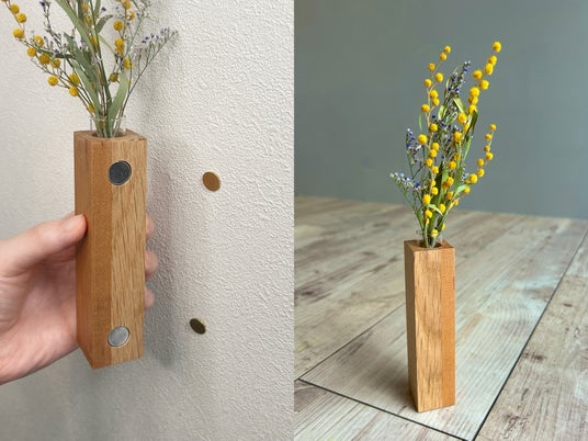 ホオやサクラ、ナラを組み合わせた一輪挿し。土台部分がキューブ型の「MOKURIN」と、スクエア型の「MOKURIN」マグネットタイプを展開。