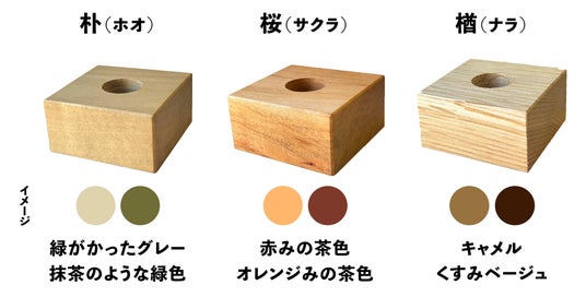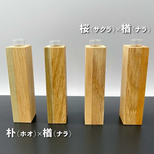 商品ラインナップは、「ホオ×ナラ」「サクラ×ナラ」の2種の組み合せとなります。樹種や個体によって木目や色味が異なる、世界に一つだけの一輪挿しです。