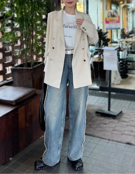 最旬トレンドのひとつ、サイドフリンジデニムパンツ。