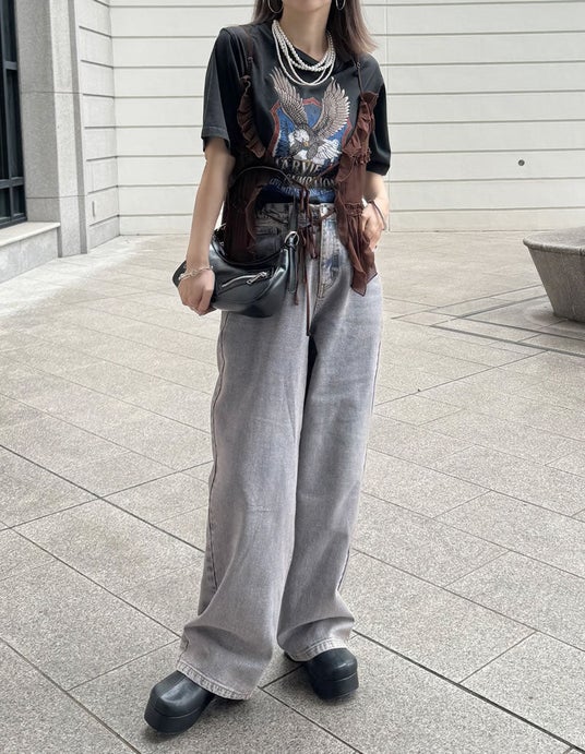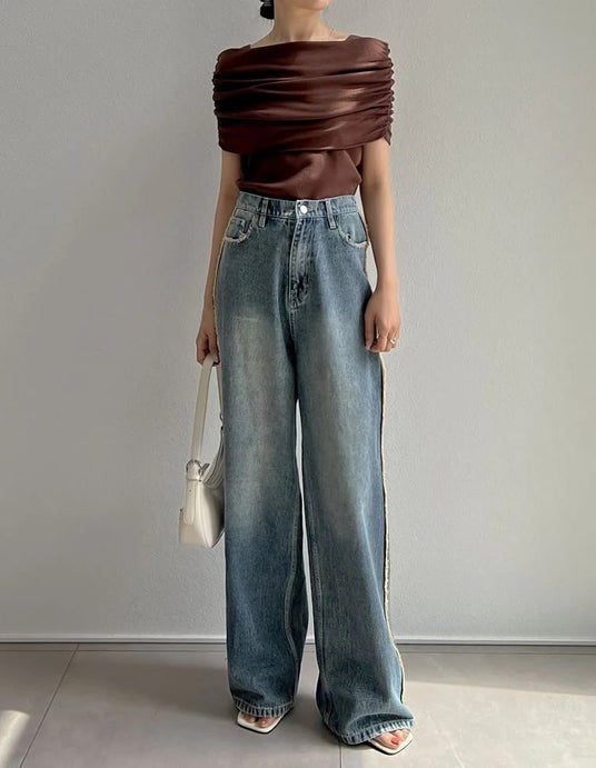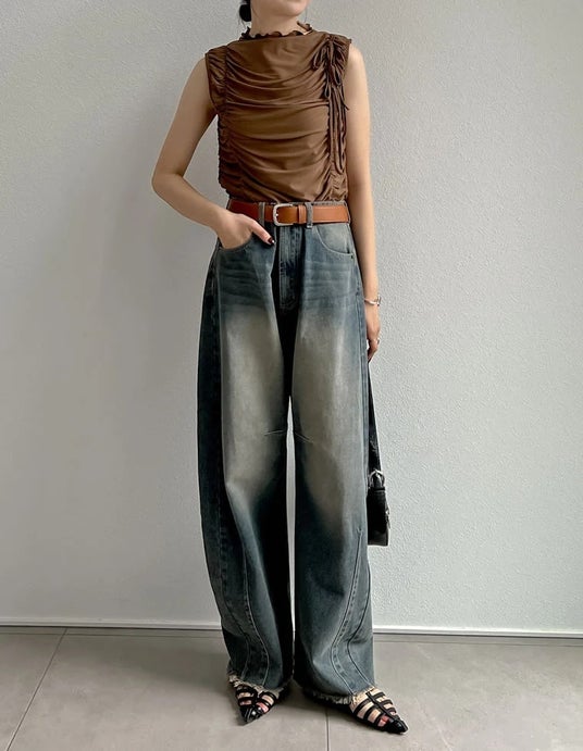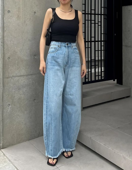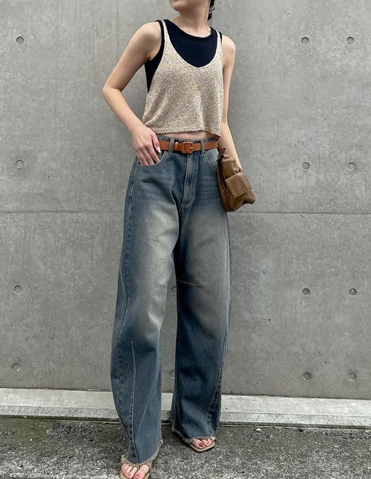 程よくワイド&ストレートのシルエットなので美脚見えするのもリエディのデニムならでは。