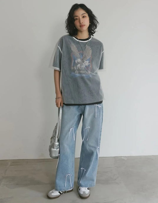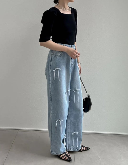 取り外し可能なリボンがセットになったワイドデニムパンツが登場。