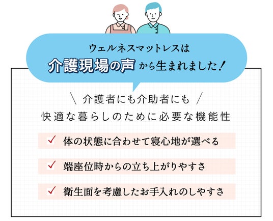 ウェルネスマットレスは、介護施設から住宅介護まで幅広く活用いただけるマットレスです。