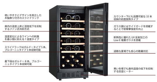 本製品は昨年発売した小型セラー「FJP-57GS」と同じ前面放熱タイプであり、20本収納の「FJP-57GS」よりも一回り大きく、33本収納の中型タイプセラーとなります。前面放熱ですので、通常のワインセラーのように据え置きとしての使用はもちろん、カウンター下などへビルトインとして設置することも可能です。