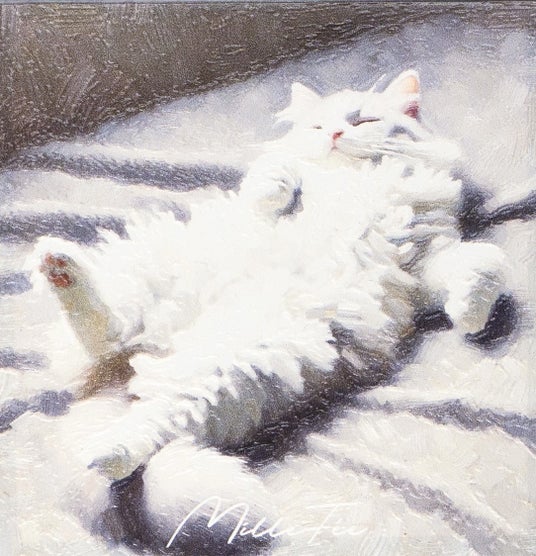 今にも飛び出してきそうなほど、リアルで写実的な猫の描写がポイントです。SNSでも人気のポーズ「へそ天」やクリームパンのようなおててなど、猫好きにはたまらない仕上がり。