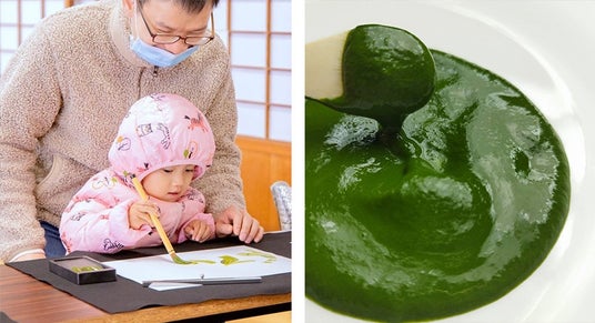 捨てられる野菜と抹茶を配合した食べられる「緑色染料」。食べられる食品だから、口に入っても安心安全(試食もできます)