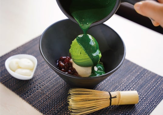 アフォガードはイタリア語で、affogato「溺れた」という意味を持ち、温かい飲み物をかけて食べるデザート。これを風味あふれるお濃茶ソースでアレンジしました。