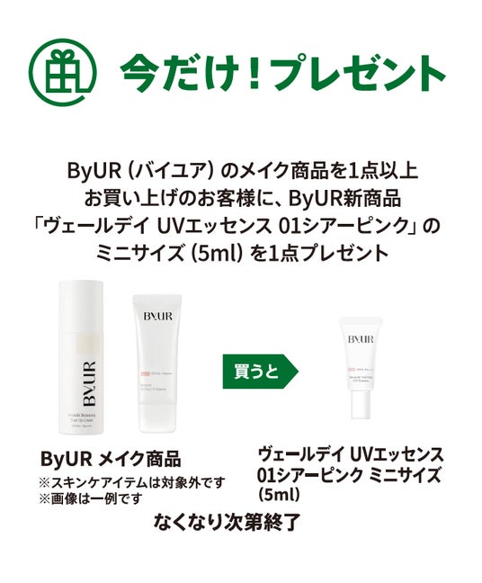 ByUR(バイユア)メイク商品を1点お買い上げで、「ヴェールデイUVエッセンス01シアーピンク」のミニサイズ(5ml)を1点プレゼント。