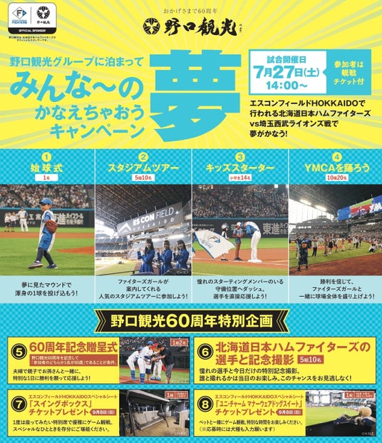 今年で60周年記念を迎える登別石水亭では、野口観光がスポンサーを務める北海道日本ハムファイターズのイベントが当たるキャンペーンや、ファイターズ商品が付いた宿泊プランを販売。