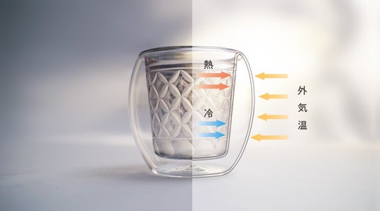 ダブルウォールグラスのため、従来のグラスよりも飲み物の温度が逃げにくい構造。冷たい飲み物は氷が溶けにくく、温かい飲み物は冷めにくいため、長時間できたてのおいしさを楽しめます。