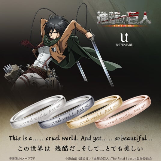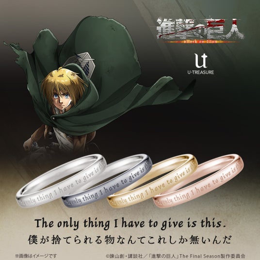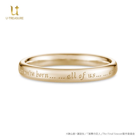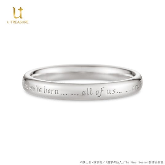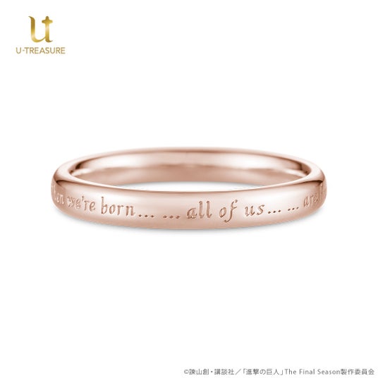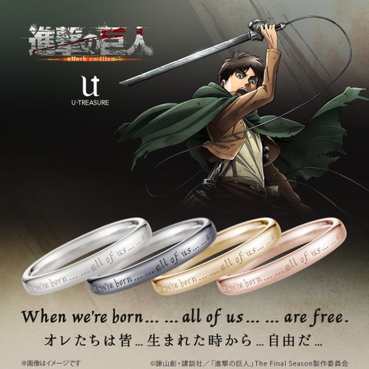株式会社ユートレジャー(本社:東京都新宿区、代表取締役:伊藤 崇史)は、TVアニメ『進撃の巨人』とのコラボレーションアイテム「シンプルメッセージリング(指輪)」を2024年5月30日(木)~6月27日(木)の期間限定、ユートレジャーコンセプトストア池袋、ユートレジャーオンラインショップにて予約受け付けを行います。