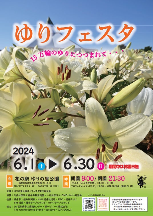 福井県坂井市の花「ゆり」の祭典、ゆりフェスタが6月1日から6月30日まで開催されます。開催期間中は15万輪のゆりの花が皆様をお出迎えします。開催初日のオープニング式典には坂井ほや丸も登場します。