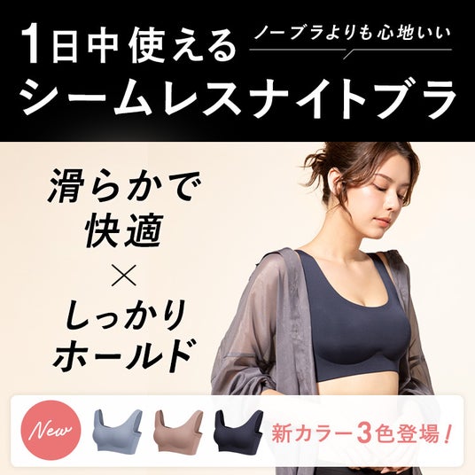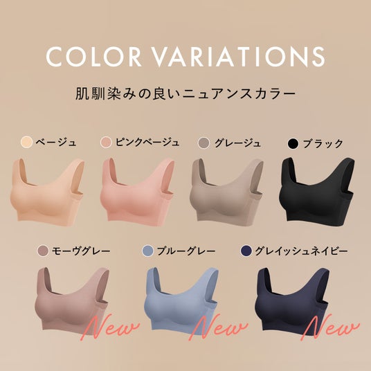 『BAMBI WATERスタイルナイトブラ シームレス』に、モーヴグレー、グレイッシュネイビー、ブルーグレーの3色が新たに加わります。優しく涼しげなニュアンスカラーがこれからの季節にぴったりです。既存の4色(ブラック、グレージュ、ベージュ、ピンクベージュ)に追加され、カラー展開は7色となります。その日の気分やファッションに合わせて、お好きな色をお選びください。