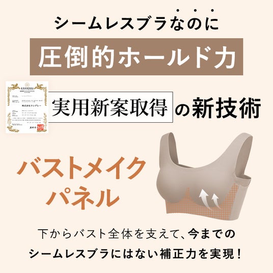 この課題を解決するために開発されたのが、実用新案取得の独自技術「バストメイクパネル」です。「バストメイクパネル」を採用した『BAMBI WATERスタイルナイトブラ シームレス』は、滑らかで快適な着心地のまま、バストを下からしっかりと支えホールドします。また、バストの横流れも防ぐことができます。