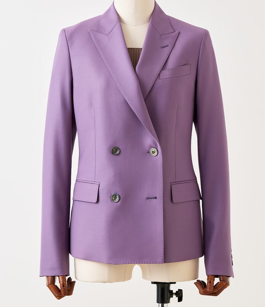 着丈着丈も短くコンパクトなシルエットが特徴で、ダブルジャケットながらスマートな印象を与えます。(オーダースーツのためお好みでご調整いただけます)