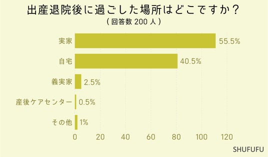 出産退院後に過ごした場所は?の問いに対して最も多かったのが「実家(55.5%)」でした。 次いで「自宅(40.5%)」「義実家(2.5%)」という結果でした。実家だと自分の親なので気を使わずに育児を手伝ってもらえて安心できそうですね。