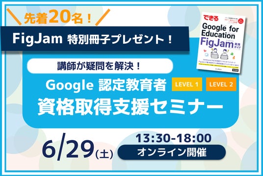 セミナーの受講をお申し込みいただいた方の中から先着20名様へ『できる Google for Education FigJam 実践ガイド(特別版)』をプレゼントいたします。Google Jamboard(TM) の後継デジタルホワイトボードである FigJam の基本操作から授業実践のアイデアまで、分かりやすく解説!本冊子は、書店で販売されていない非売品です。資格とともに、今話題の FigJam についての特別な冊子も手に入れて、ICT活用の幅を広げましょう!