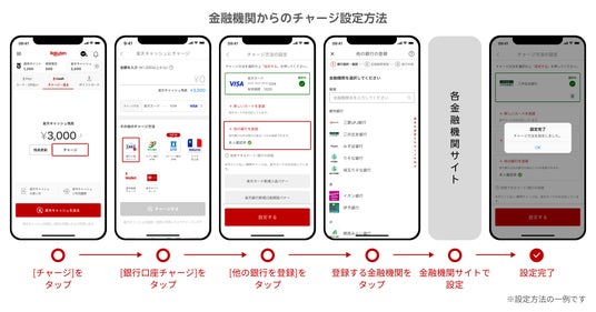 「楽天ペイ」アプリは、だれでも便利、だれでもお得なアプリを目指し、「楽天キャッシュ」へのチャージ方法の拡大に努めています。今年2月には「楽天銀行」以外の全国の金融機関口座からのチャージが可能になり、4月には「ローソン銀行ATM」での現金チャージ、「楽天ラクマ」の売上金からのオートチャージも開始しました。今回、チャージが可能な金融機関を60以上追加し、より多くの方に利用いただけるようになりました(注2)。今後もさらに多くの金融機関への対応を予定しています。